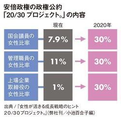 安倍政権は政権公約の1つに「20/30(にいまる・さんまる)」を掲げた。これは、「20年」までに、国会議員や上場企業取締役といった「指導的地位」に女性が占める割合を「30%以上」とする目標。実際、アベノミクスの3本目の矢である成長戦略の中核に「女性の活躍」を取り上げ、「保育所の待機児童ゼロ」「3年間の育児休業」とともに「役員の1人は女性」と数字をあげて推進していく構えだ。