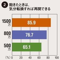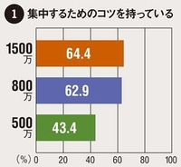 たとえば「テレビを消す」(取締役・1500万円台)といったオーソドックスなものがあるかと思えば、「満腹になって眠くならないように食事は腹8分目でやめておく」(課長・800万円台)、「ヘビメタを聴く」(取締役・1500万円台)、「歩きながらやる」(部長・1500万円台)といったユニークなものも。集中力向上のツボは、人によってだいぶ差があるようだ。
