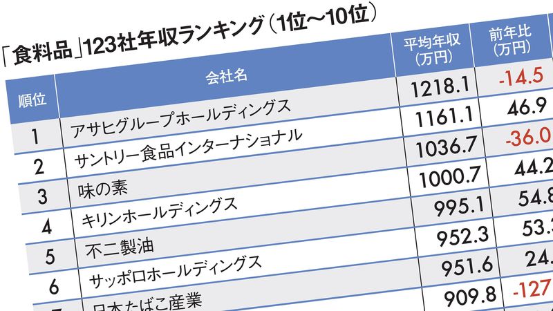プレジデントオンラインは、全上場企業の「平均年収ランキング(2025年度版)」を作成した。調査対象会社3709社のうち、「食料品業」に分類される企業は123社だった。1位はアサヒグループホールディングスの1218.1万円だった。平均年収ランキング「サービス業」編をお届けする――。(第7回)