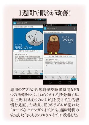 まず、1週間の起床・就寝時間や寝返りの頻度といった睡眠データを計測。その結果をスマートフォンなどの専用アプリに送信して、9種類の「ねむりタイプ」のうちどれに分類されるのか、眠りの特性を診断した。眠る時間が遅く、就寝・起床時間ともにばらつきのある井上氏は、「ルーズなモモンガタイプ」と判定。さらに井上氏自身は、「帰宅すれば倒れるように眠るため、寝つきは良い方」と自覚していたが、睡眠データをみると実は熟睡するまで30分程度かかっていることも分かった。