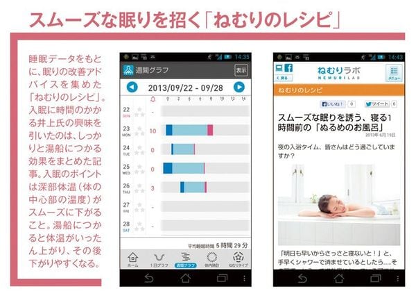 自身の眠りを把握したら、次は改善ステップだ。専用アプリでは、個別の睡眠改善アドバイス「ねむりのレシピ」を提案する。これは、各種統計データや睡眠に関する研究など、科学的知見に基づいてまとめられたもの。井上氏が実践したのは、入浴に関するアドバイスだ。「いつも効率優先で入浴はシャワーのみで済ませていましたが、アドバイスを参考に、湯船につかって身体を休めるよう心がけました」。また、設定した時間の範囲内で最も目覚めやすいタイミングにアラームが鳴る機能も、快適な覚醒を手助けした。