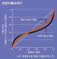 そうした行動経済学における「決定の重み付け」をグラフ化した。横軸に本来あるべき客観的な確率をとり、縦軸に決定の重み、つまり主観的な評価で修正された確率をとっている。おのおのの確率は0.1の間で示される。傾きが45度の直線が歪みのない合理的な重み付けなのだが、決定の重み付けは直線にはならず、曲がりくねったS字型の非線形モデルで表される。