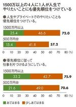 ところが「優先順位」の中身には大きな差が見受けられる。「人生やプライベートでのやりたいことも優先順位づけしているか」という設問になると、年収1500万円以上の7割以上が「あてはまる」「少しあてはまる」と回答しているのに対して、年収500万円台では5割台にとどまり、その差が15ポイント近くも開いている。