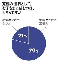 高学歴よりも高収入を選択した親は「高学歴が高収入につながる世の中ではないから」「学歴がすべてではなく、世の中をうまく渡れる人になってほしい」「高学歴だからと言って収入が保証されるわけではない。しかし、学歴はカネで買える」などとコメントしている。一方で、少数派ではあるものの、高年収よりも高学歴を選択した親は「金があっても使い方がわからない馬鹿にはなってほしくない」「人生の豊かさは教養の高さによって決まると思う」と辛辣だ。「高学歴を誇る人も、高収入を誇る人も下品だが、低学歴高収入には、水商売の香りがする」という意見もあった。