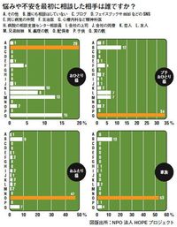 図で告知を受けて最初に相談した相手を見ると、プチおひとり様は「実の親」、おふたり様と家族が「配偶者」の回答が多数を占めるなか、おひとり様のトップは「誰にも相談はしていない」。約2割にのぼった。