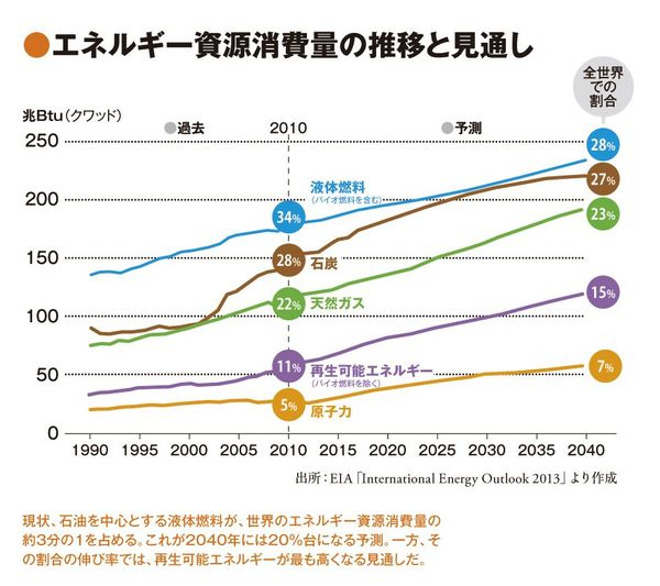 【山家】EIA(米国エネルギー省エネルギー情報局)は約30年後の2040年、原油を中心とする液体燃料(バイオ燃料を含む)が最大のエネルギー源であり、次いで石炭、天然ガス、再生可能エネルギー、原子力になると予測しています。この順番は現在も同じですが、液体燃料などが減少しているのに対して、再生可能エネルギーの伸び率は一番高くなっています(グラフ参照)。