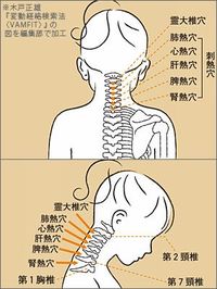 子供は首を前に倒す。親は図の第2頸椎~第1胸椎の間にある6つのツボを上から順にしごく。痛くて気持ちのよい箇所を探し、そこを温める。