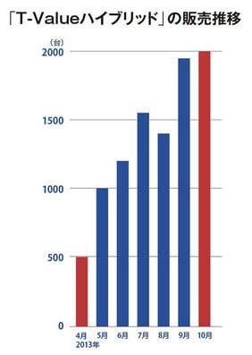 販売車両の「商品化力」と販売後の「保証」──。この2つの“駆動力”は、トヨタの販売前線を大いに活気づかせている。いまやU-Carでもハイブリッド車が特別なものではなくなり、今後も「アクア」をはじめとする人気車種が、続々と中古車市場に出てくるはず。トヨタは、昨年を“ハイブリッドU-Car元年”と位置づけているが、その戦略も十分にうなずけるものだ。事実、象徴である「T-Valueハイブリッド」の販売台数は、右のグラフのとおり、わずか半年間で4倍に増加している。