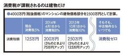 まず住宅の場合、消費税は何にかかってくるものなのかを整理しよう。消費税は不動産価格すべてにかかるわけではなく、建物の部分だけにかかるものだ。例えば、本体価格4000万円のマンションで建物価格部分が2500万円なら、2500万円にしか消費税はかからず、土地価格部分の1500万円にはかからない。図のように、2500万円の建物価格部分にかかる消費税は、5%の現在は125万円。10%になると250万円と倍になるが、物件価格4000万円に対して10%課税され、400万円になるわけではない。