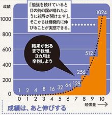 勉強の努力と学習効果は、「べき乗」の関係にあることが知られています。つまり勉強量と成績の関係は単純な比例関係ではなく、むしろ幾何級数的な急カーブを描いて上昇する。1、2、4、8、16、32……という具合に最初はゆっくり、しかし勉強を続けるほどに成績は長足で伸びていくのです。