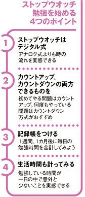 ストップウオッチ1つあれば始められます。まずはお子さんの今日の宿題から計ってみませんか?