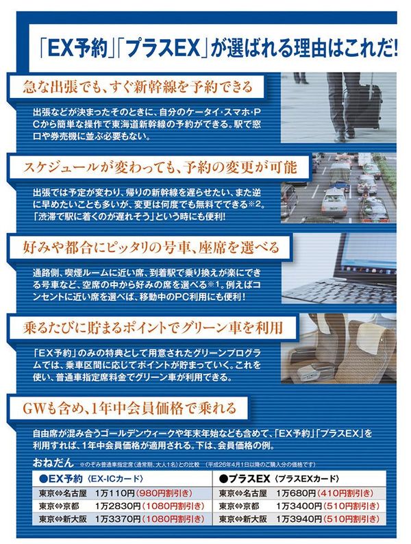 Sponsored | JR東海 2014/03/24 0:00 「EX(エクスプレス)予約」「プラスEX」が選ばれるこれだけの理由! PRESIDENT 2014年4月14日号 タイアップ広告制作グループ 提供元:JR東海 ※1 残りの座席数が少ない場合、この機能は使えないことがあります。 ※2 改札入場前またはきっぷのお受け取り前かつ予約した列車の発車時刻前(変更前の列車発車時刻の直前かつ変更後の列車発車時刻の6分前)に限ります。 次ページ 1 2 3 プレジデントオンライン JR東海 : 「EX(エクスプレス)予約」「プラスEX」が選ばれるこれだけの理由!