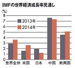 2013年10月、IMF(国際通貨基金)は13~14年の世界経済の成長率見通しを発表。それによると、13年は2.9%、14年は3.6%である。アメリカやユーロ圏などの先進国は、13年の1.2%から14年は2.0%に持ち直すものの、中国、インドなど新興国の経済は減速していくという。