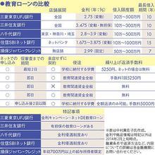 教育ローンの比較表。表は中村真佐子氏作成。金利や商品情報は特記以外は2014年2月上旬時点。融資条件や返済方法など、内容についての詳細は各金融機関にお問い合わせください。