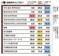 まず図1「結婚相手としてOK?」を見るだけで、すでに三高は神話となったことがわかる。女性たちは「学歴」や「大企業」というブランドよりも、「実」を重視していることがわかった。実とは「安定した収入を稼ぐ正社員」のこと。ボーダーラインは年収300万円以上の正社員で、正社員であれば学歴は問わない。小さな会社でもかまわない。男性が思うほどに高望みではなく、現実に合わせて「結婚相手の条件」もサイズダウンしている。非正規や小規模の自営業、フリーランスは安定性の欠如から敬遠されるようだ。高学歴フリーターなどは最も嫌われる。大学や企業のブランド力はほとんど通用しなくなっているのだ。