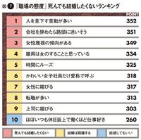 調査概要/楽天リサーチの協力を得て、インターネットを通じて従業員数300人以上の企業に勤務する30~49歳の秘書100人より回答を得た。集計結果を独自の方法でポイント化してランキングし、各項目で「死んでも結婚したくない」の割合が多かったものを「死んでも結婚したくない」に分類(以下、「結婚は躊躇する」「結婚してもいい」も同様)。調査期間は13年8月2日~5日。