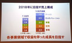 津賀社長は事業方針説明会の中で、2014年度を「成長戦略を仕込む重要な年」と位置づけ、創業100周年に当たる2018年度に売上高10兆円を目指す目標を掲げた。5年間で売上高を2兆6000億円、3割以上増やす計算だ。