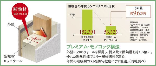 高度な断熱性を支えるのは、オリジナルの「プレミアム・モノコック構法」。モノコック構造は航空機などに用いられる堅牢な構造だが、三井ホームは屋根・壁・基礎すべてをオリジナル開発し、一般的な2×4工法をはるかに凌ぐ耐震性、耐火性、耐久性を実現した。