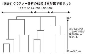 似たもの同士を分類、グループ化するクラスター分析の結果は、このような樹形図で表す。