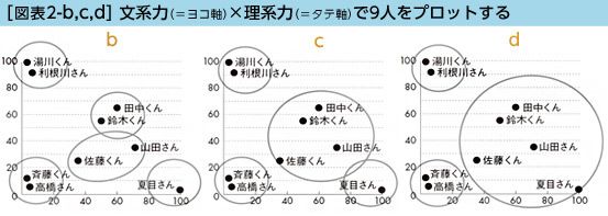 2年1組は突出した才能をもった学生が多いクラスですが、一目でわかる最初の3つのクラスター(湯川くん・利根川さん、斉藤くん・高橋さん、夏目さん)はともかく、問題は比較的バランスのとれた鈴木くんや山田さんの解釈です(前出、図表2-a)。