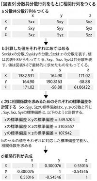 次に、x、y、zそれぞれ2者間の関係をマトリクス化した表、つまり「分散共分散行列」の表をつくります。Aさんは間違えないように教科書をなぞりながら表(図表9a)を書いてみました。そして、それぞれのセルにあてはまる数値を、これまでに行った計算結果からもってきます。