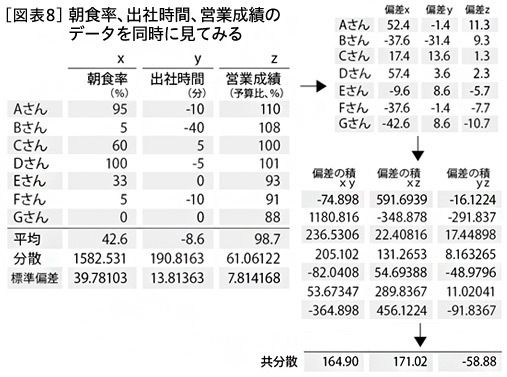 まず、これまで計算に使ってきたx、y、zのデータをまとめてみます。xとyの偏差の積はまだ計算していなかったので、同じように計算しておきます(図表8)。