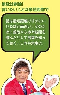 たとえば「するんですね」の語尾についている「ね」は、必要なのか。余分だと思ったらカットする。こうやってそぎ落としていって、主語と述語だけが残ればいいぐらいのイメージを持つ。最後には主語も述語も省いて、黙っているだけで笑いが起きるのが私の理想です。