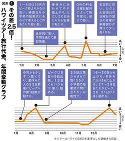 図表1 その差2.5倍! ハワイツアー旅行代金、年間変動グラフ
