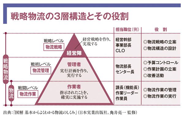 あと大事なのは、戦略物流では「戦略」─「戦術」─「戦闘」の各レイヤーを、整合的にしっかり管理することです(下図参照)。ある衣料専門店チェーンは、特定地域でトップシェアを目指すとき、まず24時間稼働の大型物流センターを開設しました。これで配送頻度を上げ、店舗在庫を削減。狭い店舗物件でも出店可能とすることで出店攻勢を実現したのです。まずトップシェアを獲るという戦略があって、物流センターや店舗オペレーションなどの戦術、戦闘へとつなげていく。このように企業戦略と物流現場を連携し、外部のパートナーとも協調した取り組みが、戦略物流の真骨頂だと私は考えています。