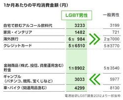 「全体的に、家の中のことにお金をかける傾向があります。例えば、家具やファブリックなどのインテリア、家で飲むためのアルコール飲料や食材、映像、音楽、ゲームソフトなど。アフター5などは外食より家飲みというライフスタイルが多いと思われます。また、旅行に関しては、まだLGBTへの理解が進んでいない国内では、男性同士がホテルにチェックインしづらいといった事情があります。そのためか、同じLGBTでも男性のほうが海外旅行の支出額が高くなっています」(同)