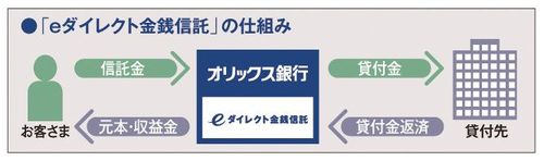 金銭信託とは、銀行が投資家に代わり、資金を管理・運用する金融商品で、信託終了日に、元本と収益金の分配を行う。昨今の金融商品は投資先や運用方法が多様化・複雑化している。その点、オリックス銀行の「eダイレクト金銭信託」は、きわめてシンプルな商品設計となっている。オリックス銀行が顧客から集めたお金を厳選した企業1社に一定期間貸し付けて、元本や収益金を得るという仕組みだ。