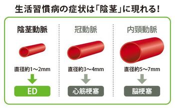 陰茎動脈は非常に細いため、血管の変調による影響を受けやすい。つまり勃起力の低下は、血管障害の要因となる生活習慣病の症状を自覚できる貴重なサインと言える。