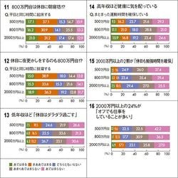 休日の過ごし方と年収には、どのような関係があるのか。まず休日の生活リズムを見ていこう。「平日と同じ時間に起床する」「平日と同じ時間に就寝する」と答えた人が最少だったのは、どちらも年収800万円台(図11、図12)。800万円台の多くを占める中間管理職は、オーバーワーク気味。日頃の睡眠不足を補うために休日は朝寝坊し、夜は寝つけずに夜更かししてしまうのかもしれない。