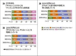 目標のリスト化についての項目では、興味深い結果が出た。「やりたいことリストをつくっている」と回答した人はどの年収層でも4割前後で、大きな差がなかった(図24)。一方、「やらないことを決めている」と回答した人は年収2000万円以上が31.8%、800万円台が21.6%で、10%の差がついた(図25)。やりたいことを並べるだけでは、周りと差別化しにくい。やってはいけないことを並べるブラックリスト方式のほうが、年収アップにつながりやすいのかもしれない。