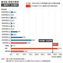しかしながら40代は3000円(1.9%)に落ち、50代となるとさらに1000円(0.3%)にまで落ち込んでしまいました。しかも、昇給0だった人が37%を占めて最多層になっているのです。