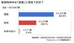 そんな訳で、勤務時間中の禁煙についても意見が分かれるようで、2008年3月の「Yahoo!ニュース 意識調査」(http://polls.dailynews.yahoo.co.jp/domestic/2002/result)では64%が禁止に賛成した。喫煙者にとっては肩身の狭い時代になった。喫煙は本人の健康管理の点からも問題になっているが、周囲の禁煙者からも「受動喫煙だ」と文句を言われかねないのが弱いところだ。だが、愛煙家も多いようで、32%が反対した。