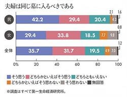 いわゆる新しいスタイルの埋葬に対しては、自分の墓を継ぐ子どもがいない人、および女性のほうが関心が高く、希望する人も多い。どちらかというと男性のほうに保守的な考えを持つ人が多いようだ。さらに興味深いのは、「夫婦は同じ墓に入るべきである」という考えについての調査結果だ。「そう思わない」「どちらかといえばそう思わない」という否定派の男性は、たった6.4%だったにもかかわらず、否定派の女性は17.5%も存在するのだ。
