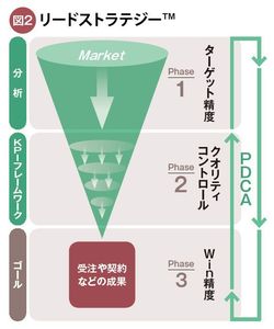 ターゲット精度を向上させるPhase1、クオリティをコントロールするPhase2、Win精度を把握するPhase3。すべてのPhaseを一貫したPDCAとしてとらえ、リードストラテジーを構築。受注や契約といった成果につなげていく。