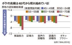 ボケの兆候は40代後半から見られることが最近わかってきた。図は45歳から70歳のイギリス人公務員(男性5198例、女性2192例)を10年間観察した結果だ。この研究で調べた認知機能は、(1)推論能力、(2)記憶力、(3)音声の流暢性(Sではじまる単語をできるだけ書き出す)、(4)語義の流暢性(例えば動物の名前をできるだけ書き出す)、(5)ボキャブラリーの5項目。10年後、各年齢層でボキャブラリーを除くすべての認知機能スコアが低下していることが確認された。