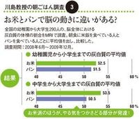 朝食に関して、もう1つ予想外だったのは、主食に関してです。米飯のほうがパンよりも脳の発達によい。この調査結果は、子供時代からパン派だった私にとっては個人的にも驚きでした。これも、幼稚園児の年齢の子供から大学生までを対象に知能検査を行ったとき、偶然発見したものでした。朝食に米飯を食べている人たちの知能指数の平均点は104点で、パンを食べている人たちの平均点100点を上回っていました。