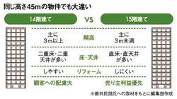 マンションで最も多いのは高さ45メートル以下の物件です。なぜなら、それ以上の高さになると、建築基準法や消防法などの規制がとても厳しくなるから。そこで広く普及している45メートル以下の物件ですが、注目すべきはその階数です。14階か、15階のはずです。さて、どちらが「いい物件」かわかりますか。