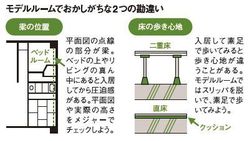 それをなくすためにも、モデルルーム見学時にチェックすべきポイントがある。新築購入時にはマイホームの夢が膨らんでいて、ついドアの形や床の材質、壁紙の色合いや感触、オプション家具の豪華さなどに目がいってしまいがちだ。しかし、絶対に確認が必要なのは、梁の位置や床といった構造上の問題である。