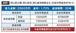 ポイントは、毎月返済額は初回が元利均等返済の場合約7.3万円、元“金”均等返済が約8.8万円となっているものの、最終返済月は元利均等返済が約7.3万円と同額だが、元“金”均等返済は年々返済額が減っていくため最終的には約5.5万円となっていること。先に多めに払う「元“金”均等返済がオトク」ということは正しそうだ。