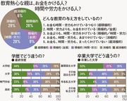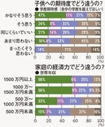 次に、(2)の「教育にお金や時間・労力をかけているか」を見ていこう。お金も時間・労力も両方かけている親を「超積極的」とすれば、これが3割弱。お金はかけないが時間・労力はかける「積極的/時間・労力」な親と、お金も時間・労力もあまりかけていない「消極的」な親がそれぞれ3割弱。以上が3大勢力だ。