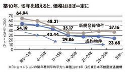 中古でも築浅のほうがいいという気持ちはわかるが、中古の価格は築5年である程度下がり、10年でさらに下がり、15年でぐっと下がるが、そこから先は落ち着いてくる。実際、中古物件の成約数のうち、半数以上を占めているのは築15年までの物件である。ただし築5年の物件の場合、そもそも売りに出る数そのものが少ない点も留意しておく必要があろう。一戸建ての場合は、価格に占める土地の割合が高いので、マンションほど落差は出にくい。