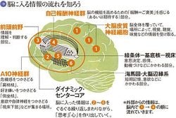 図は、そのメカニズムを表したもの。目や耳から入ってきた情報は、視覚や聴覚をつかさどる「大脳皮質神経細胞(1)」の感覚中枢にまず入り、そこから「A10神経群(2)」と呼ばれる部位に送られる。「A10神経群」には、「危機感や感動」「好き・嫌い」「面白そう・つまらなさそう」などの感情をつかさどる神経核が集まっていて、入ってきた情報にこうした「感情のレッテル」を貼り付ける重要な役割を担っている。