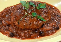 メインはメンズレシピの「ビーフ100%! 煮込みハンバーグ」。牛肉100%のハンバーグに茹でたほうれんそうをたっぷり加えて男性に必要な亜鉛をプラス。ほうれんそうが加わることで、ふっくらとした口当たりに仕上がる。