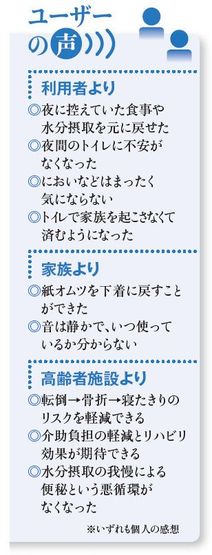 足腰の弱くなってきた高齢者の前向きな気持ちや自立を後押しするベッドサイド水洗トイレ。機能面での最大のメリットは、その名のとおり“水洗”であることだ。寝室をいつも清潔に保てることに加え、介護する人がトイレの後始末をする必要がないことも大きい。その分負担が軽くなるのはもちろんだが、排せつ介護を受けている高齢者からよく聞かれるのは、「家族や他人に自分の排せつ物を見られたくない」という声だ。言われてみれば当然だが、この水洗トイレはそうした当たり前の思いにきちんと応えてくれる。