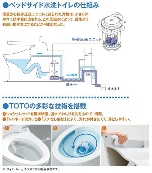 慣れ親しんだいつもの寝室におよそ1日の工事で取り付けられる。そんなベッドサイド水洗トイレを実現したのは、TOTOの最新技術だ。まず汚物を流す排水管、これを従来の水洗トイレの3分の1以下に細くした。そのため、壁に開ける穴の大きさはエアコンのダクト程度で済み、大がかりな工事を必要としないのだ。
