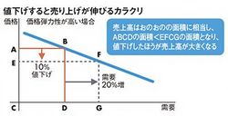 たとえば価格を10%値下げしても、需要が逆に20%増えれば、「20 ÷(-10)×(-1)」で、価格弾力性は「2」となる。このように「1」より大きい場合は「価格弾力性が高い」といって、価格が下落したときに売り上げが増える。